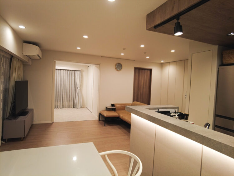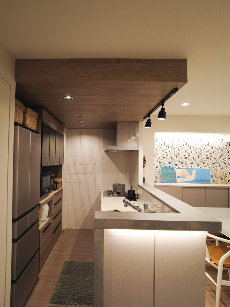 間接照明がキレイで、吊り戸棚をなくしたことで開放的になりました。