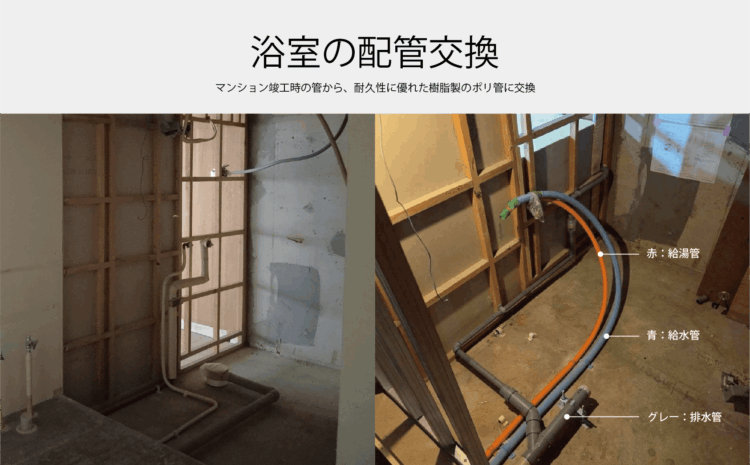 水回りの配管はマンション竣工時のままなので、築年数が古い物件の場合は基本的には交換することになります。