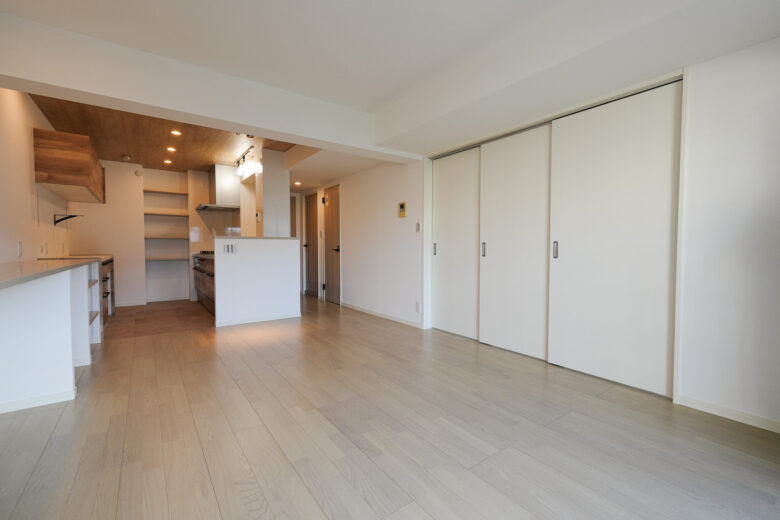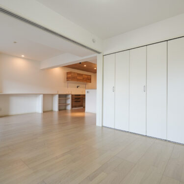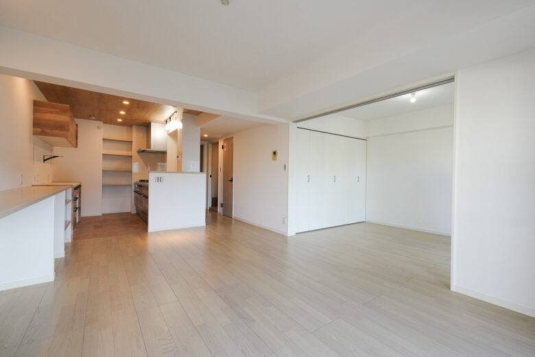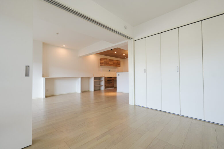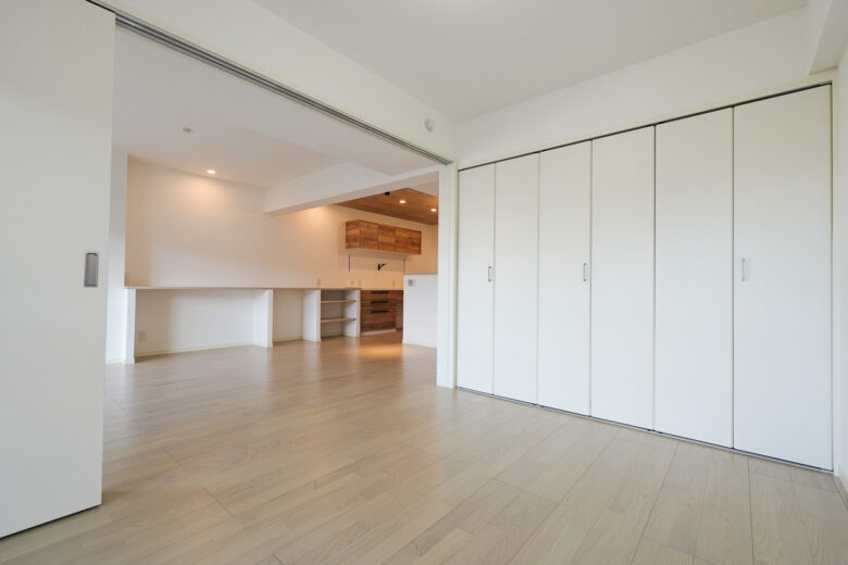 隣接する洋室との間仕切りを普段はリビングと一体で使える広々空間に。
