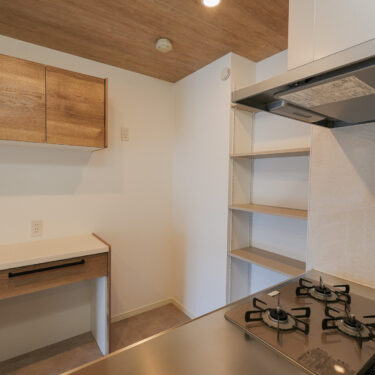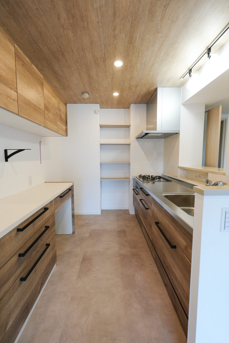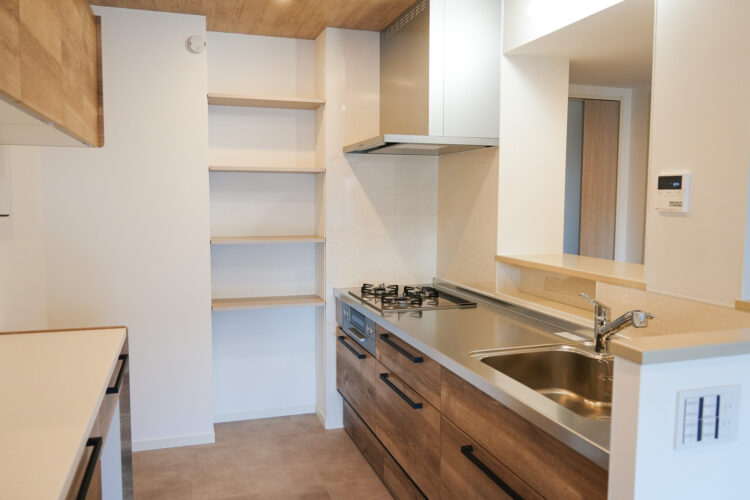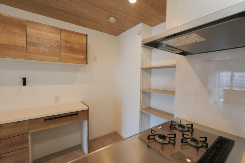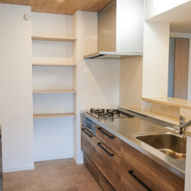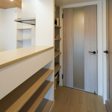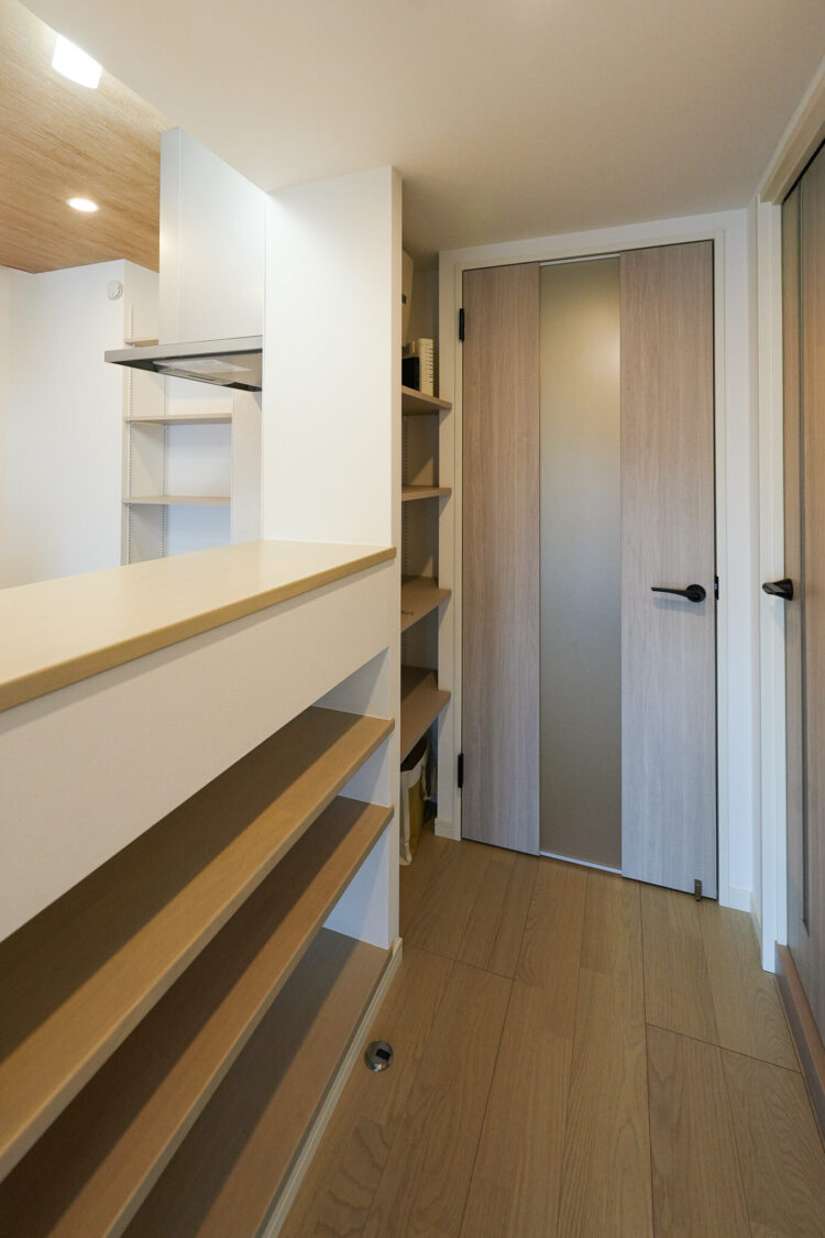 キッチンの奥にコンパクトなパントリー棚を新設し、ストック食品や調理家電などの収納スペースが増えました。