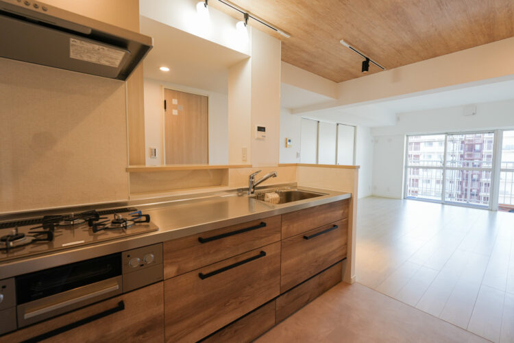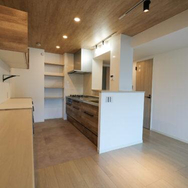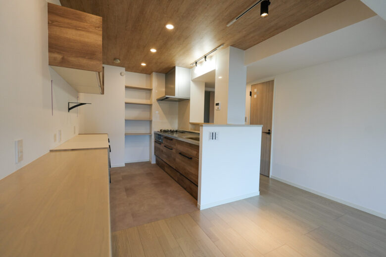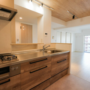 キッチンの向きを廊下側の“対面”に変更し、リビングから行き来しやすいレイアウトに。