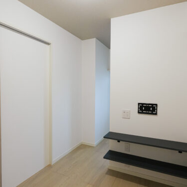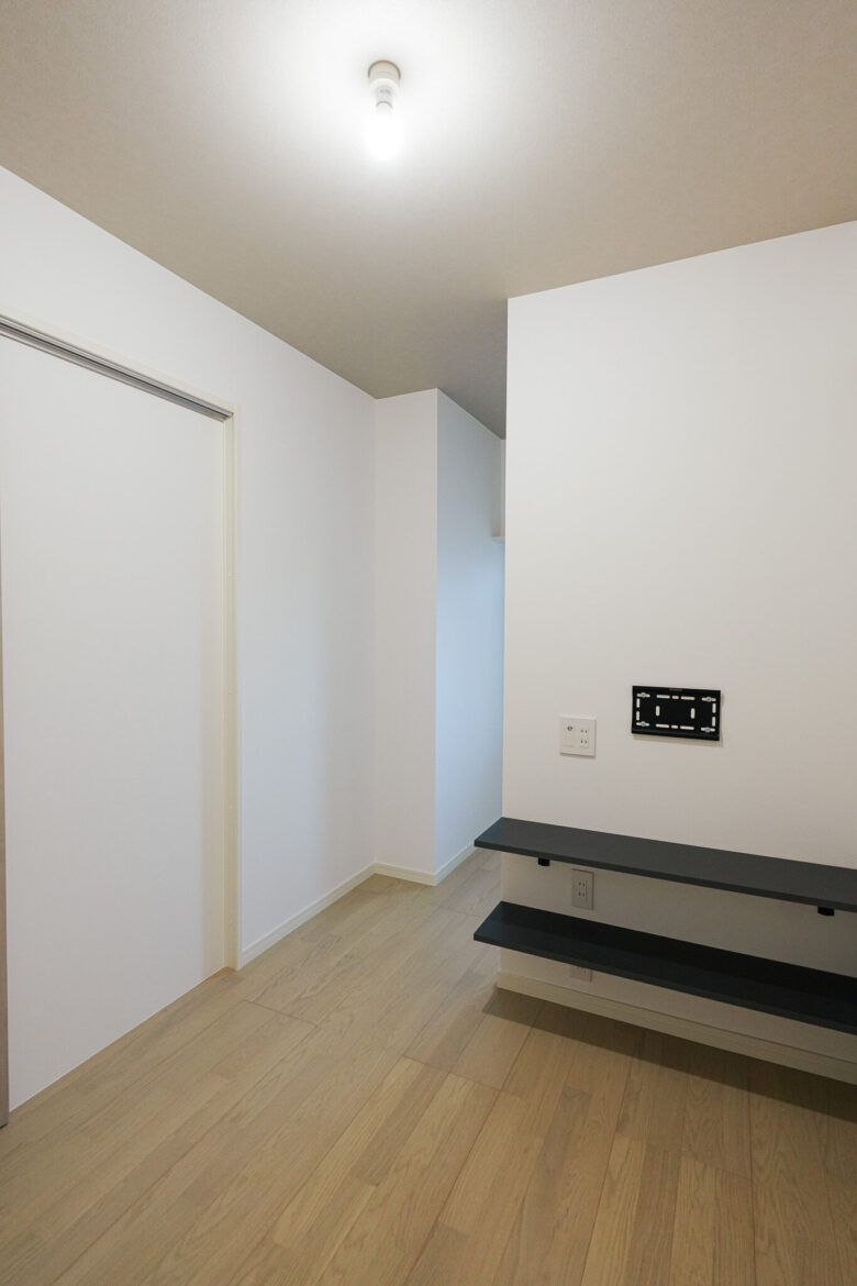 テレビ壁面の裏側に収納スペースを造作し、洋服や趣味の物などはしっかり仕舞いながら、室内からは一切雑多なものが見えない、すっきりとした空間になりました。