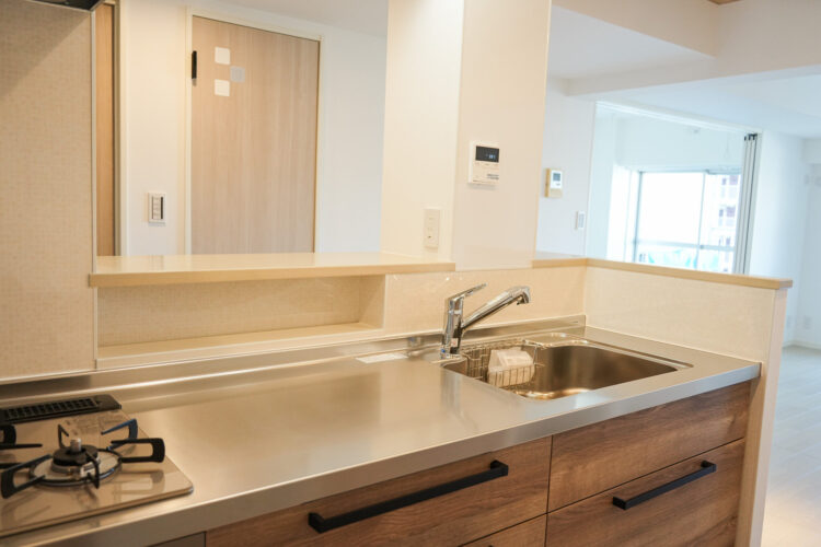 キッチンの腰壁を高く作ることで、収納量を増やすことができます。